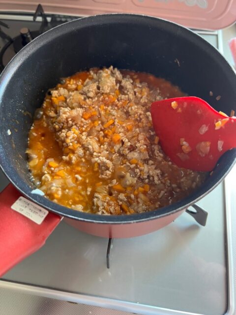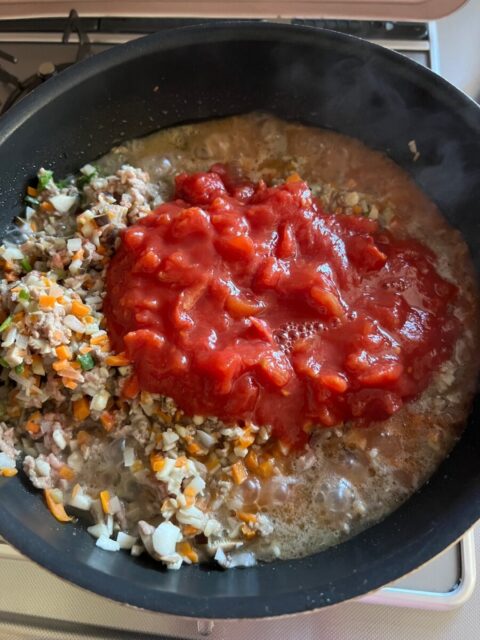 ここに、トマト缶を1缶まるごと加え、ミートソースの場合は調味料を、キーマカレーの場合は、ルウを投入し完成!子供たちはトマトやピーマンが入っていることに全く気づきません。