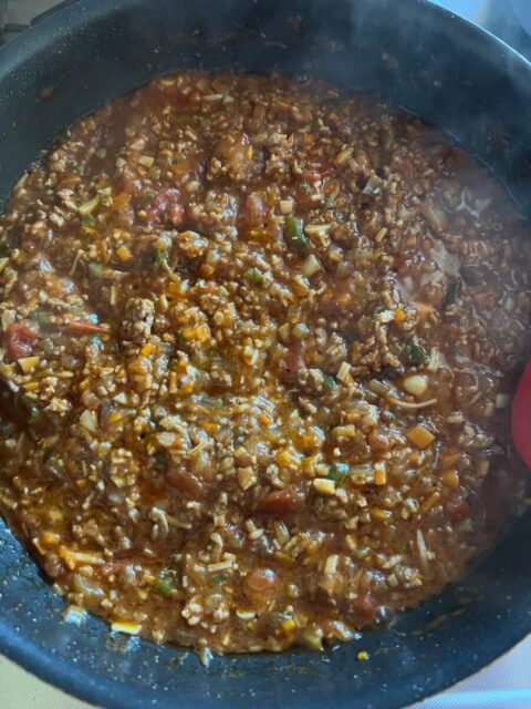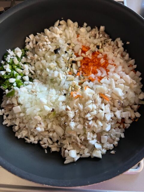 この日は、挽肉、玉葱、人参、ピーマン、茄子、えのき、エリンギを投入しました。他にも、普段なかなか食べることのないセロリやズッキーニ、パプリカなども混ぜたりします。