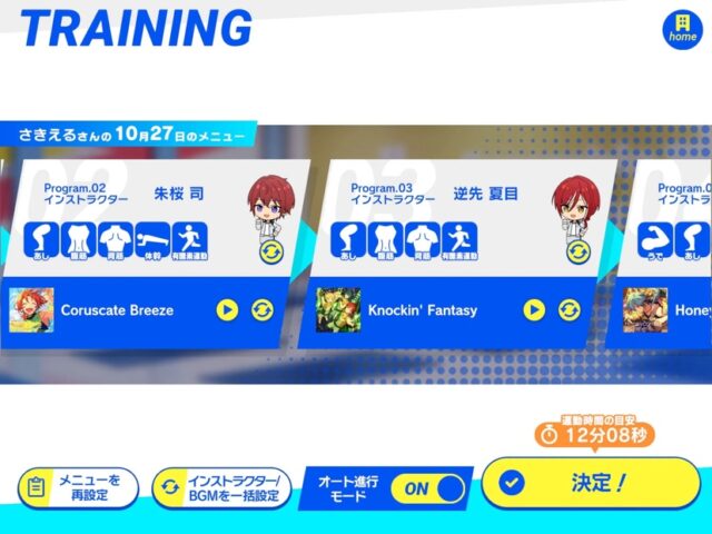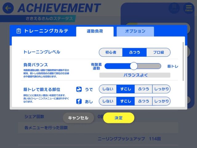 ちなみに私はトレーニングレベルを「ふつう」、負荷バランスを「バランスよく」にしているので運動時間が約12分ですが、トレーニングレベルと負荷バランスを調整すると運動時間が変わっていきます。
