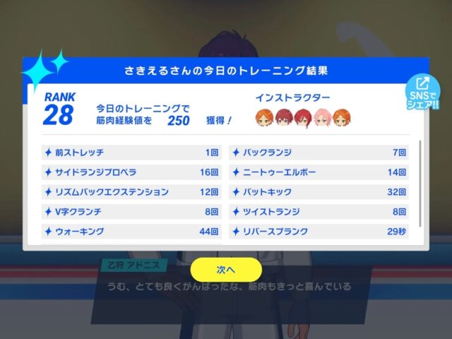 各トレーニングが終わった後、担当してくれたキャラクターから労いのお言葉ももらえます。