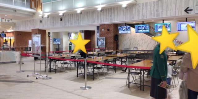 エスカレーターを上がって、インフォメーションセンターの後ろの、モニターが沢山ある所の前が会場でした。