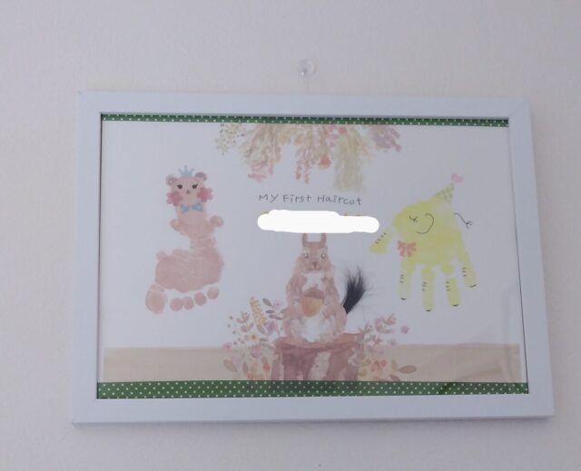 次は、長男の取っておいた、ファーストカットと手形と足形のペタペタ。りすさんのしっぽが、長男のファーストカットの髪の毛です☆