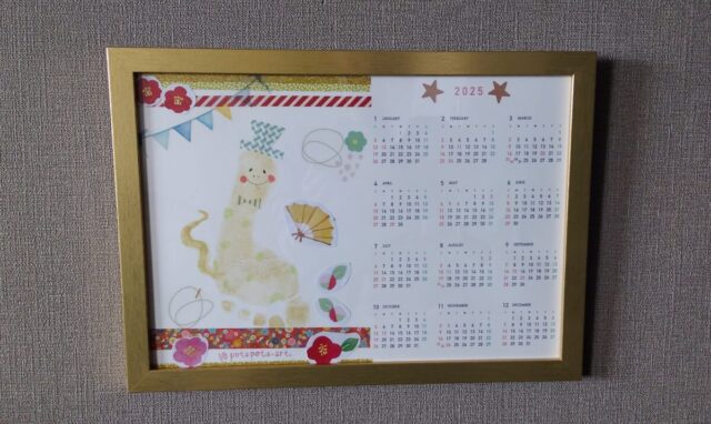 金の額に飾ってお正月っぽくしてみました☆ペタペタアートに参加されていた、もう少し大きいお姉ちゃんは、自分でラインストーンを貼ったりして、上手に仕上げていました(^^) 長男ももう少し大きくなったら、仕上げの装飾を任せたいです\(^o^)/