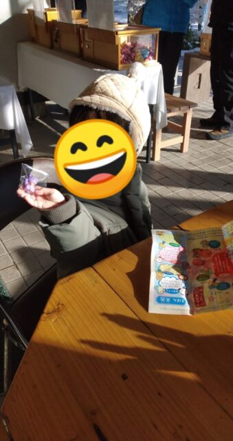 縁起物消しゴム入り。「まねきねこみぎてあげ」でした。「おかねがたまりそう」と書いてありました。いいなぁ〜