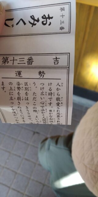「吉」!!このおみくじに入ってる、縁起物お守り目当てで、このおみくじを引きます。今年は「当たり弓」でした。
