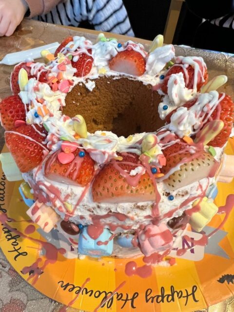 だいぶ派手なケーキになりましたが、生クリームをだいぶ薄めに塗ったのと、おたふく堂さんの素晴らしいシフォンケーキのおかげで、完食♪