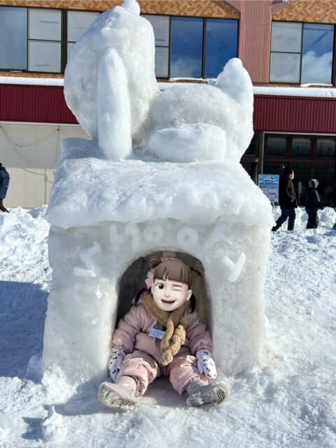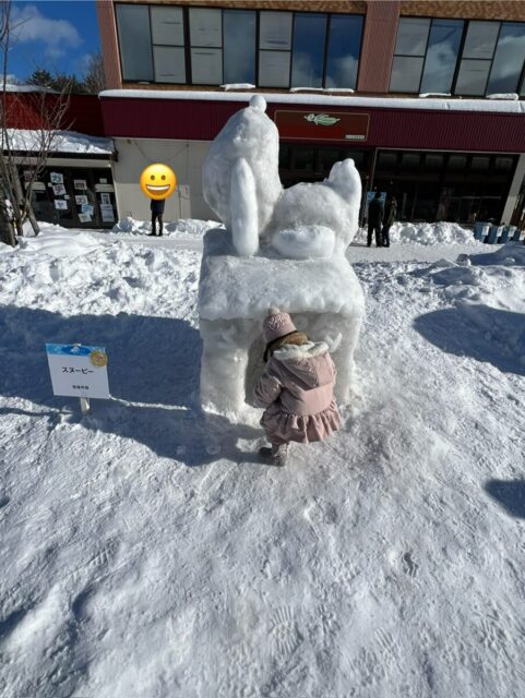 入り口付近には素敵な雪像がたくさん飾られていました。スヌーピーの雪像は、かまくらになっていて、娘がすっぽり埋まりました(笑)