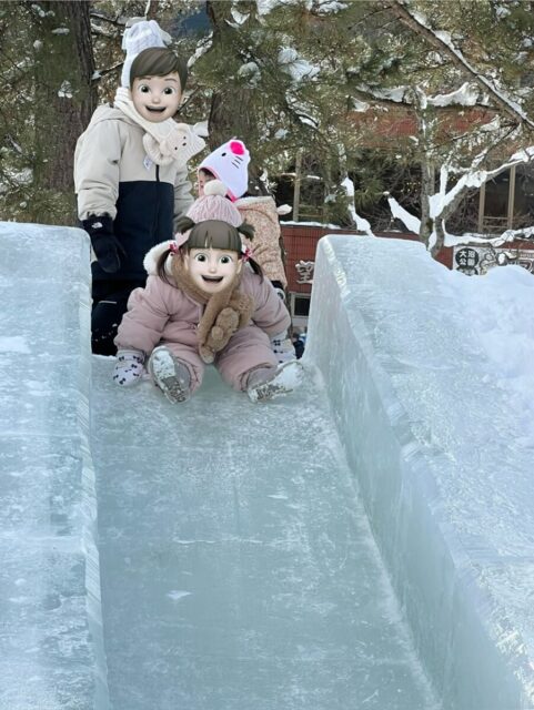 氷の滑り台が見えると、子ども達、大興奮でダッシュ!こちらは小さい子向けの短い滑り台ですが、長い滑り台は大行列で、3回も並び親はヘトヘト。子ども達はすごい楽しそうでしたが、かなりスピードが出るので、私は寿命が縮まりました(笑)