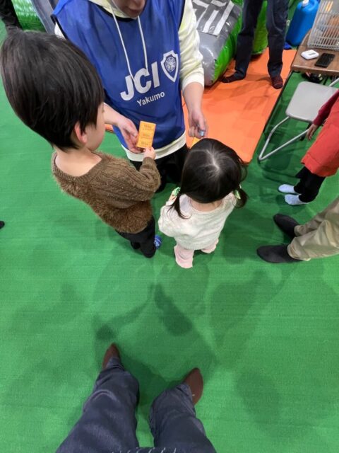 まずは、小学生以下を対象としたゲーム大会に参戦!今年は、スコップでボールをバケツに入れるゲーム。入らなくても景品もらえます。