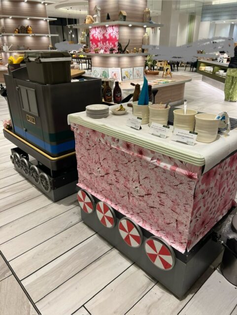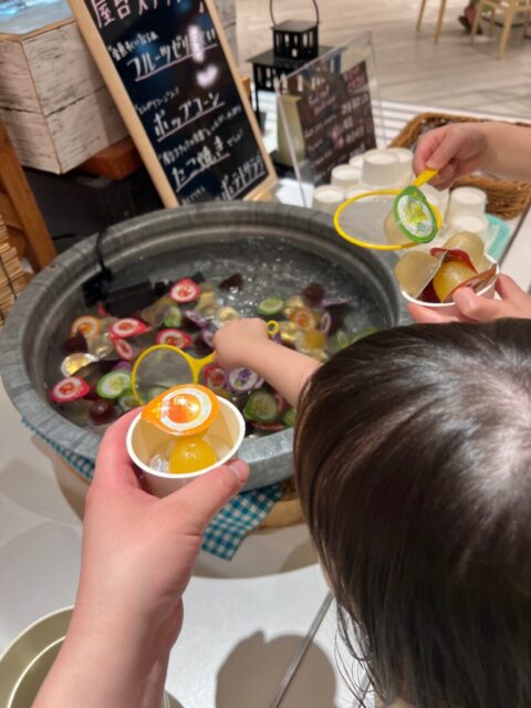 エプロン、子ども用食器、椅子など全て揃っていて、子ども用のバイキングコーナーは台が低くなっているので、子どもが自分で食べたいものをとれるように配慮されていました。かき氷やポップコーン、ゼリーすくいなど、子どもが喜びそうな縁日コーナーもあり、大興奮!