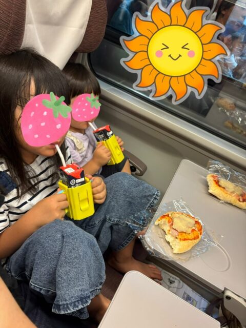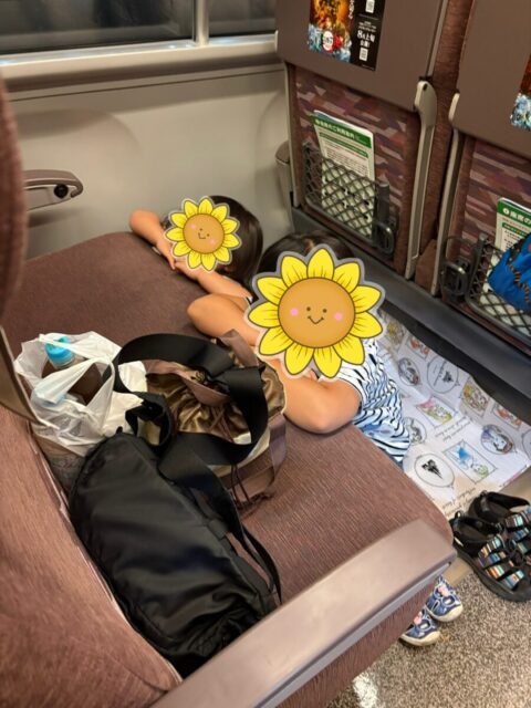2年前の帰省と同じ…レジャーシート出動!!次女はまだ膝の上なら料金がかからない。との事だったので、2人席に3人で座りました。