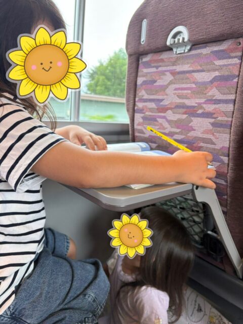 宿題するわ〜と言い出した長女。次女は暇になり、ちょっかいを…長女が使っていた特急、飛行機暇つぶしセットを引っ張り出しました。