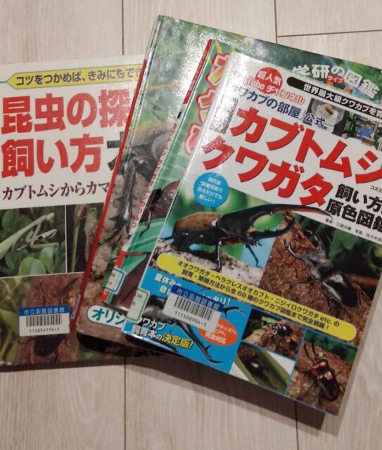 幼虫を育てるのは初めてで、インターネットや、YouTubeでも調べますが、中央図書館で、クワガタについての本を借りてきました。