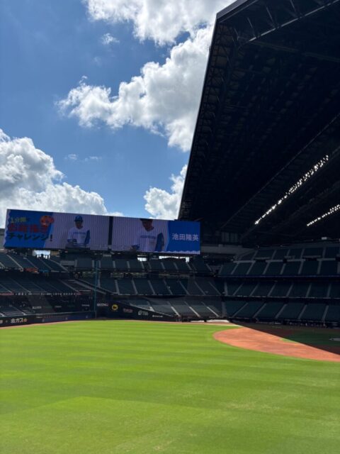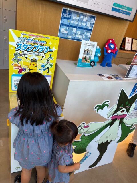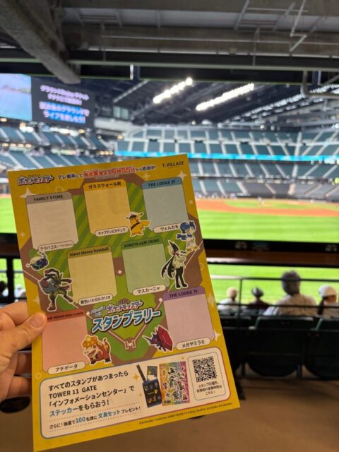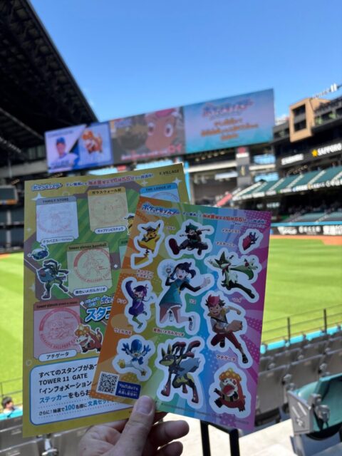 シールをもらいました。大型ビジョンにポケアニのCMが流れ、横には日ハムの選手をポケモンに例えると?と買いてあったり。姉妹は真剣に見てました。