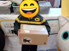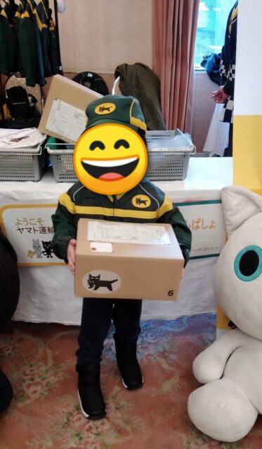 クロネコヤマトブースで「さあさあ、こっちこっち」とお声がかかり、あれよあれよと長男に合ったサイズの制服を着せて頂き、「これ持ってね〜」と渡され、記念撮影。ヤマトのお仕事体験をさせて頂きました。小さいサイズのヤマト制服可愛すぎます♡