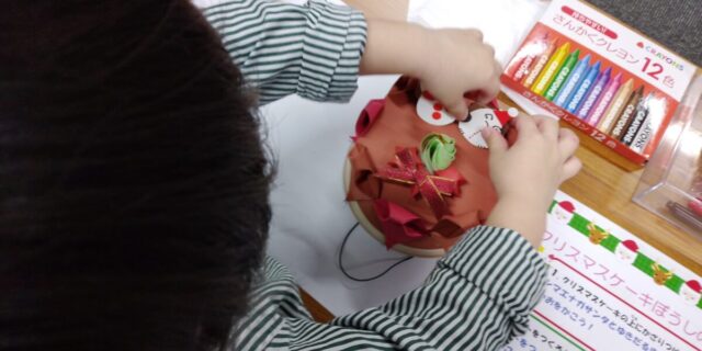 説明を聞いて、折り紙でケーキにつける飾りつけを作ったり、雪だるまとシマエナガに顔を描いたり。