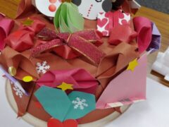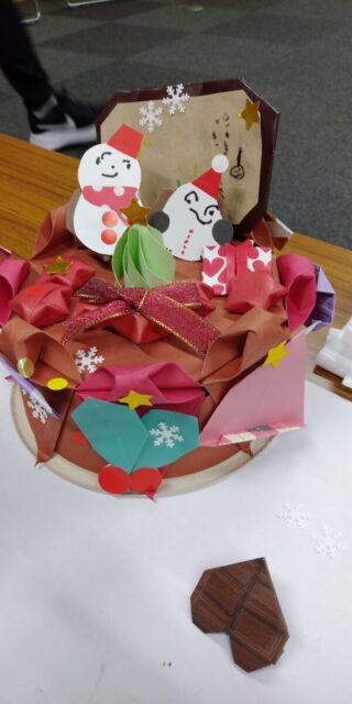自分達で折った飾り以外にも、沢山の飾りつけを準備して下さっていて、こんなに可愛いケーキが完成しました!帽子にも写真立てにもなる素敵なケーキです。