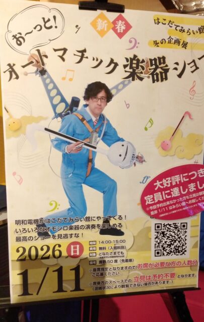 以前、キッズプラザに遊びに行った時に、みらい館で明和電機さんのショーをやると知り、座席は事前予約制だった為、予約スタート日に夫に頑張ってもらい、無事座席をゲットする事が出来ました。