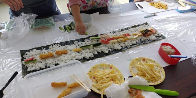それぞれ持ち寄った具材で、巨大のり巻き作り。