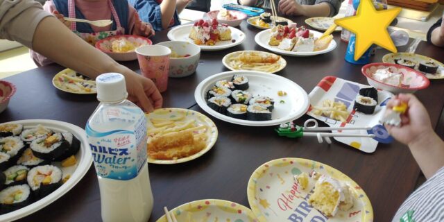 調度、2月、3月2人、4月と誕生月が続いているため、お友達と合同お誕生会を行いました。