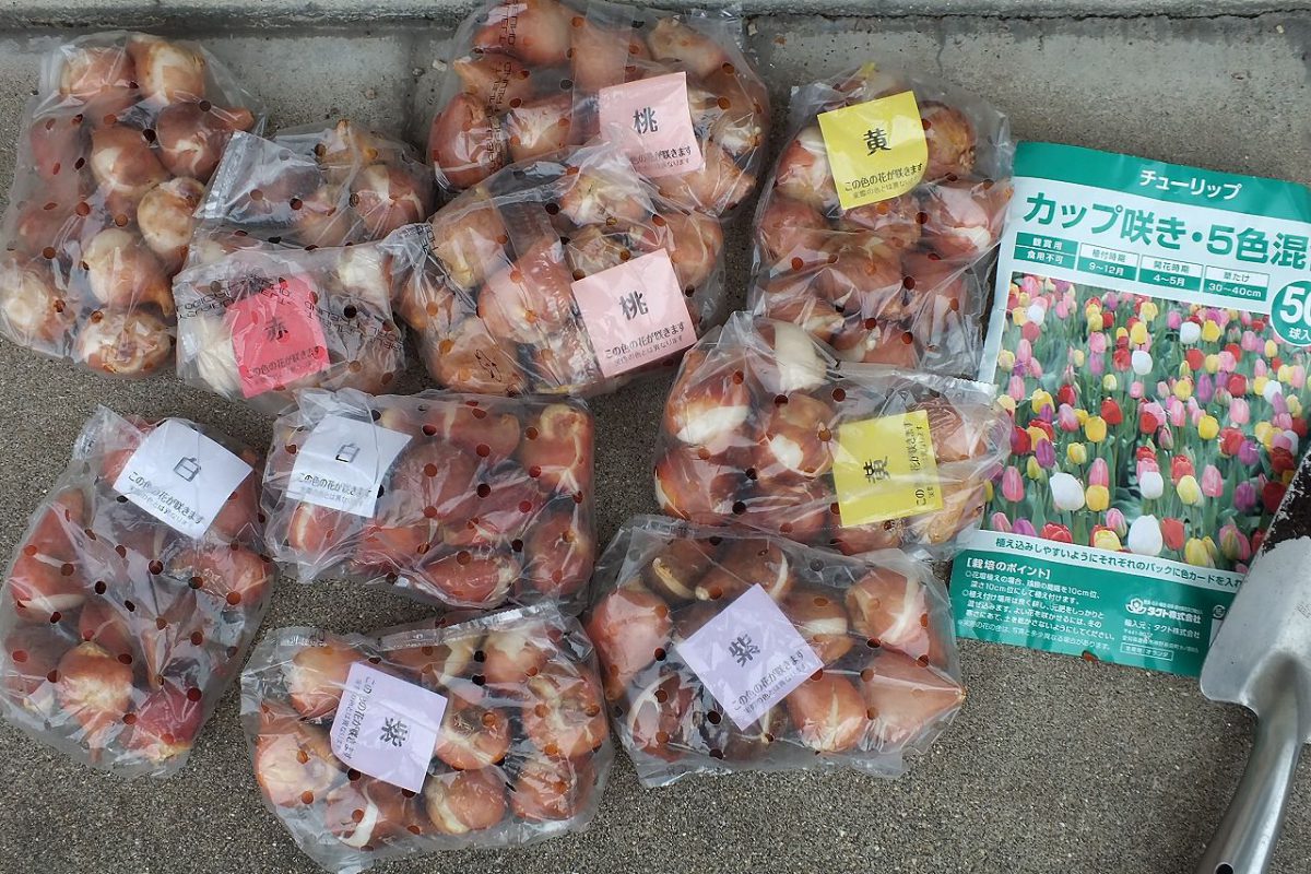 ホームセンターで購入したチューリップの球根100個(各色20個)。