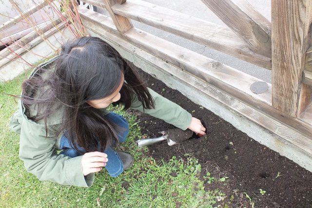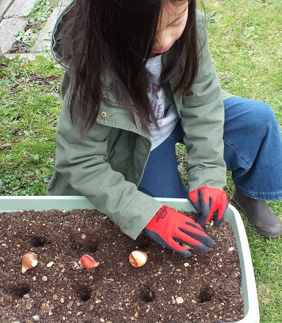 まず最初に、プランターに10個(各色2個ずつ)植え込むことに。尖っている方を上にして、2個分の深さに押し込み、優しく土をかぶせ