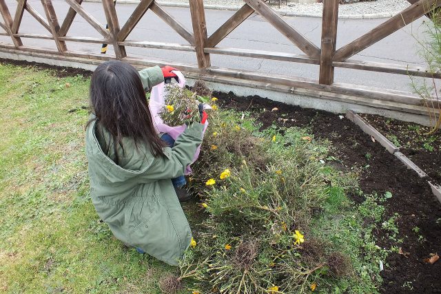 咲きかけのマリーゴールドが、少し残っているけど…、雪が降る前に始末することに。孫と一緒に球根を植え込むベストタイミングが、日曜日の今日なので。