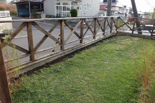 次に、木製フェンス沿いに、15センチ間隔・深さ10センチで、55個植え込みました。