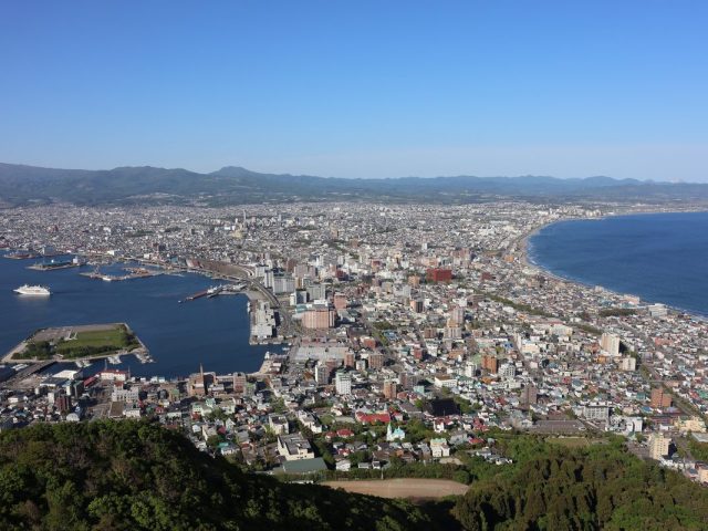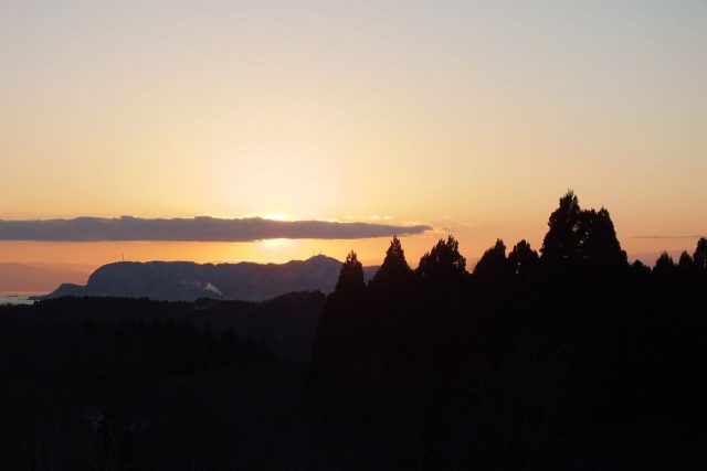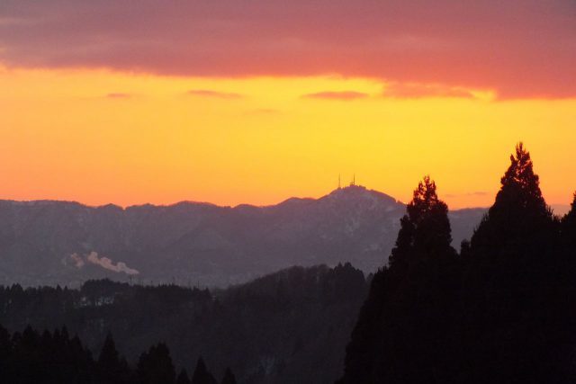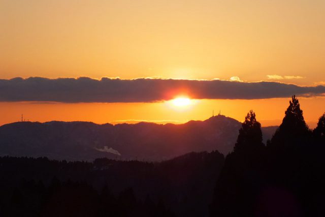 鮮やかなオレンジ色が山や雲のシルエットに映える