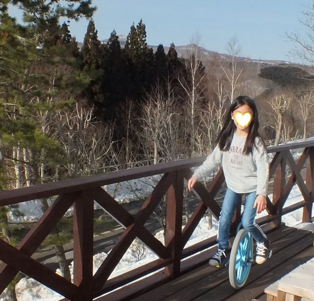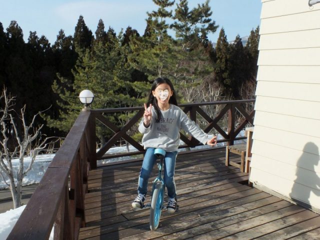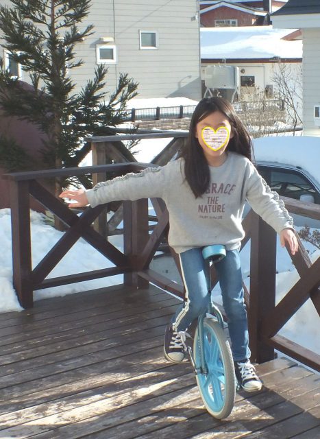 数日前まで、そり遊びに興じていた孫娘は、久しぶりにお気に入りのウッドデッキで一輪車遊びを堪能。