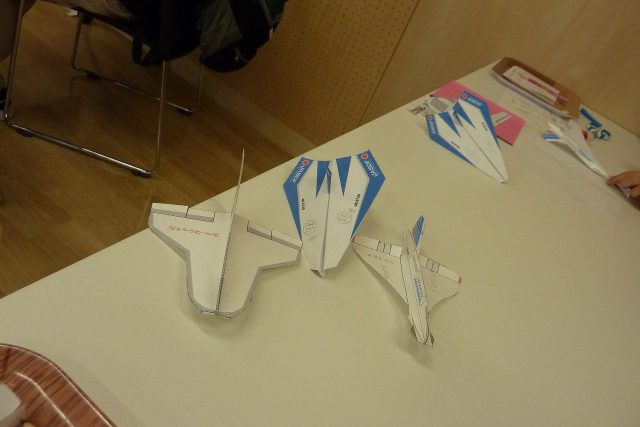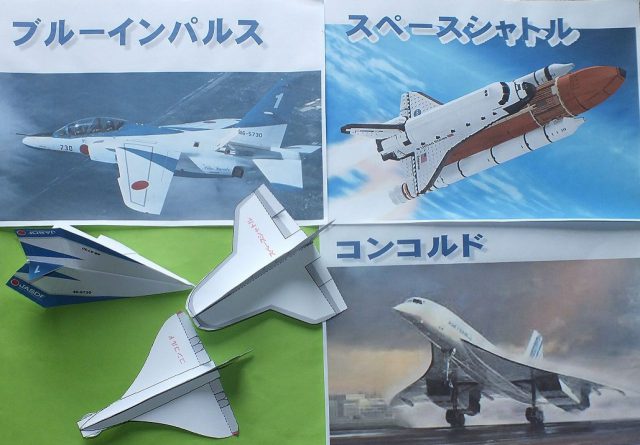今回の内容はブルーインパルスにあやかって「紙飛行機で遊ぼう」。ケント紙や折り紙で作った飛行機は4機(ブルーインパルス、スペースシャトル、コンコルド、よく飛ぶ!折り紙飛行機)。