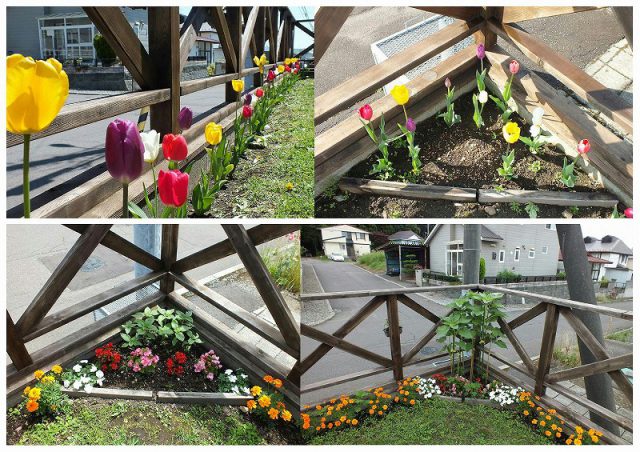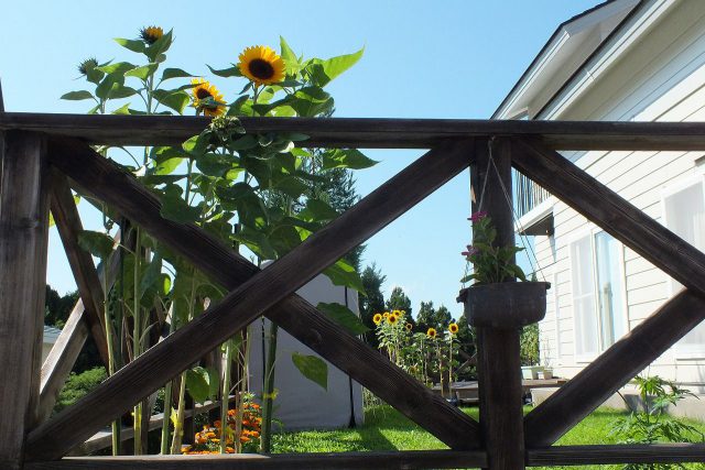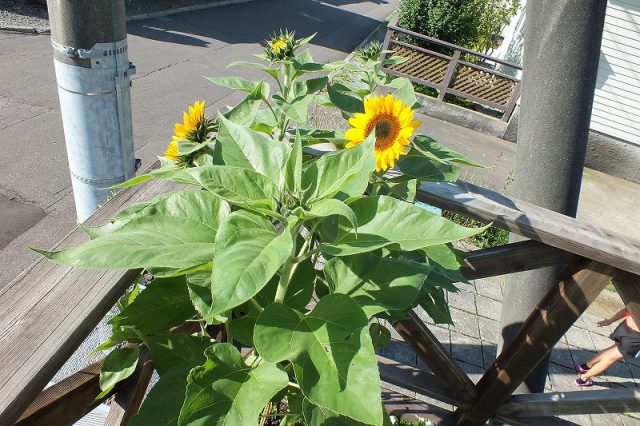 初夏の庭を彩ったチューリップの球根を掘り起こした後に種まき(6月14日)し、生育した向日葵が、猛暑と強風に耐え初秋の風景に彩りを添えている。