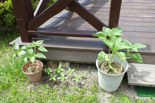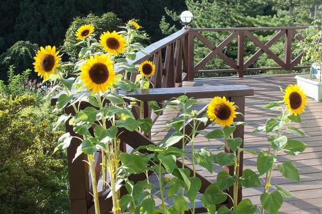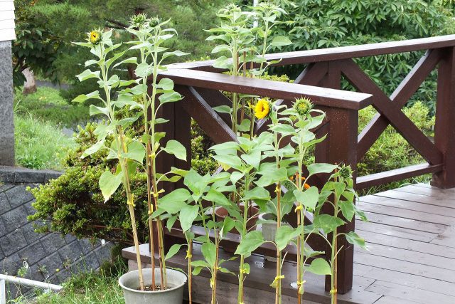 昨年庭で実を結んだ種を選別して保管し、プランターやウッドデッキのコーナーに一粒ずつ願いを込めて植えた向日葵。適時の水やり、追肥、支柱立て等々と、大事に育てること二か月余り。