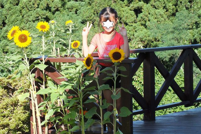 青空と深緑をバックに鮮やかに映える向日葵。孫をはじめ家族みんなが、待ち望んだ順調な生育と開花。