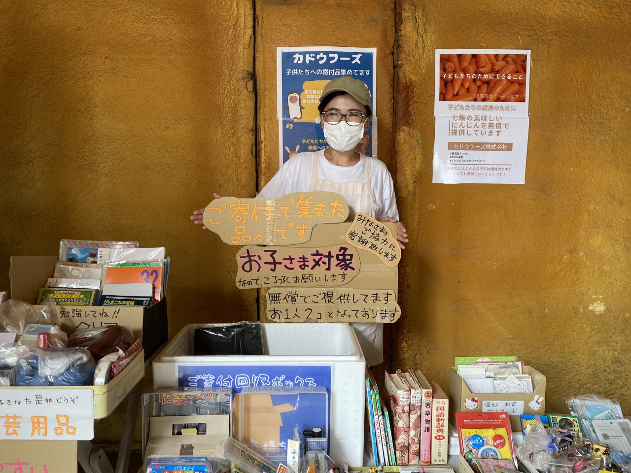 子どもたちを笑顔にしたいと、カドウフーズの嘉堂聖也社長と奥さんの美樹さんでスタートした「無償配布」。寄付で集まった文具や規格外のにんじんなどを直売店スペースで配布しています。
