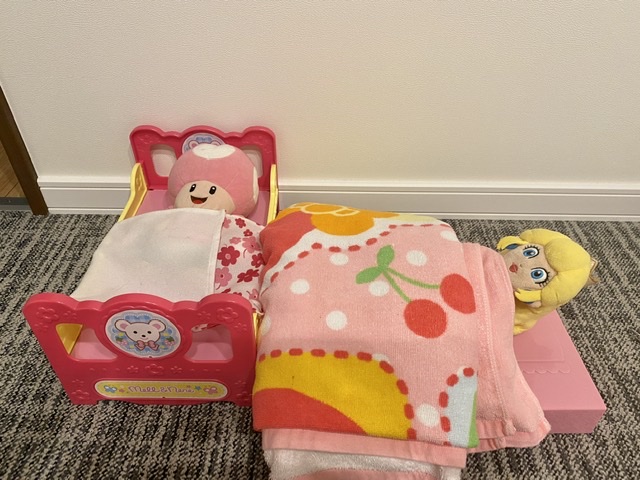 ここに布団を敷いてメルちゃんたちを寝かすのかと思いきや、こちらはキノピコとピーチ姫がおさまったようです。