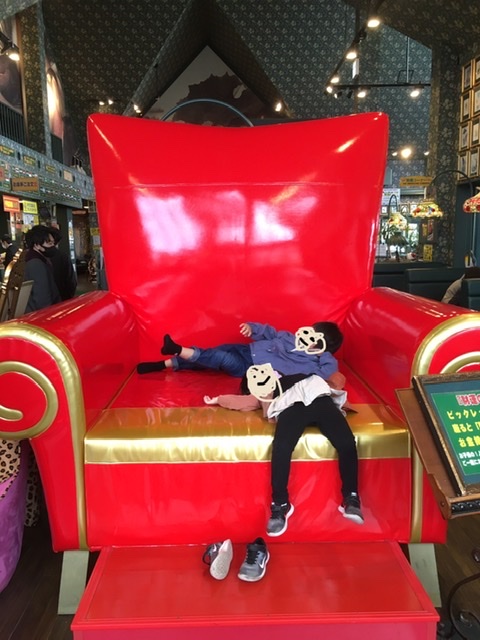 子どもたちがまだよちよち歩きの頃から、顔ハメパネルがあると写真を撮っていたせいか、今ではパネルを見つけると使命感にかられたかのように一目散で顔を穴につっこむ子どもたち。