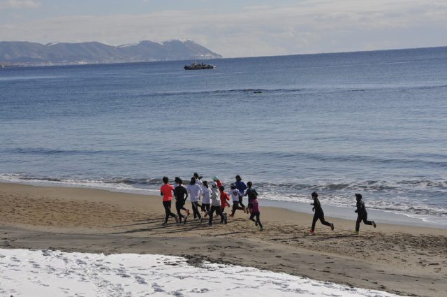 練習メニューは、波打ち際の砂浜を軽くアップした後、200m×10、100m×10のタイム走と男女に分かれてのリレー。砂に足を取られながらの練習は、脚力と持久力アップには最適。心地良い波音をBGMに、潮風をきって走るランナー達は、みんな真剣そのもの。