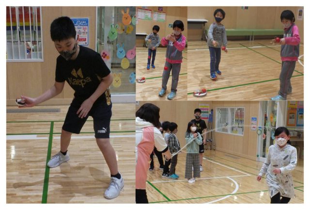 最後の遊びは、コマ回し・けん玉・大縄跳び。