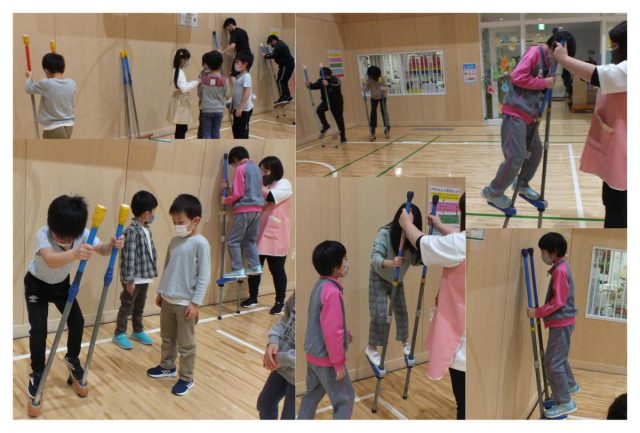 続いての遊びは、一番人気の竹馬。踏板(ステップ)の高さを調整してある4台の竹馬に挑戦。壁を支えにして恐る恐るステップに立ち、バランスをとりながら自力で踏み出そうとしたり、先生に支えてもらったりしながらの大奮闘。短時間で数歩進める子が出現。