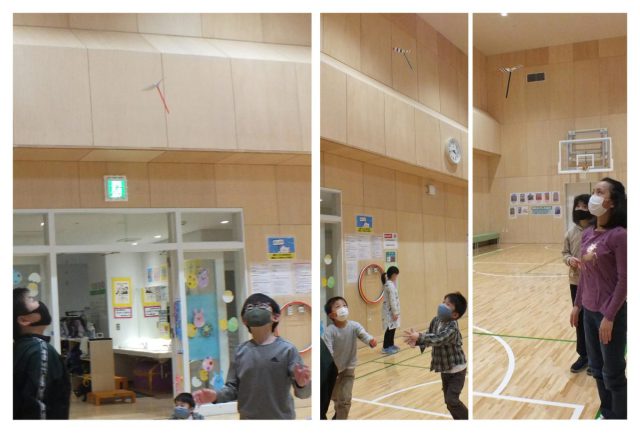次の遊びは、竹トンボ飛ばし。牛乳パックを羽にし、ストローを回転軸にしたトンボは、天井近く(?)まで飛行。