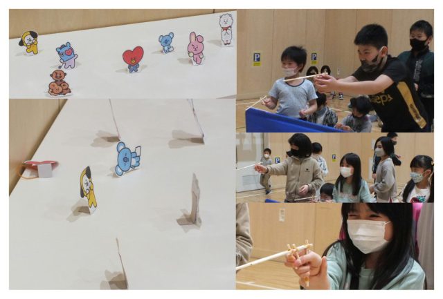 途中休憩の後は、割りばし鉄砲での的あて遊び。標的は、BTSのキャラクター。