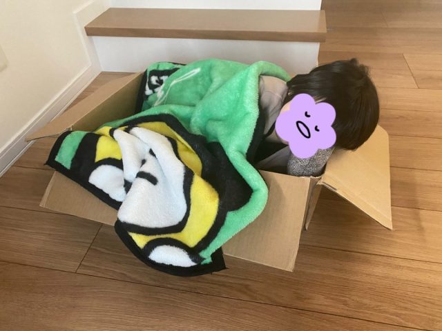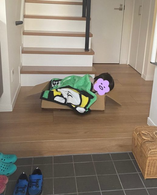 なんでもお父さんが帰ってくるのを段ボールに入って待っているうちに寝てしまったんだとか。いやでも、ブランケットまで用意して枕もして、完全に寝る気だったよねあなた笑