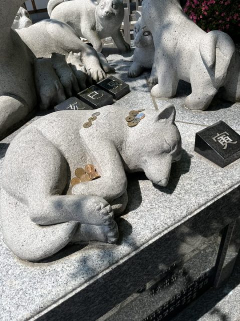 12匹の子犬がいまして、安産祈願は産まれてくる子の干支の犬をなでなで…人によってはお賽銭も!娘は亥のため、お腹が大きくなった時にはなでにくかったのを覚えてます。次は寅…手前で助かった〜ε-(´∀`;)ホッ