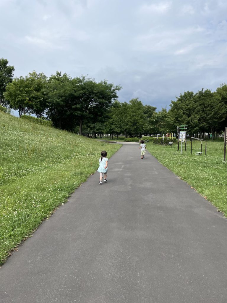 公園についてダッシュ!普段抱っこマンの下の子もダッシュで水遊び場へ!