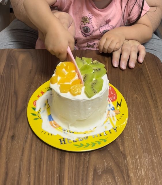 さぁさぁ、娘と夫でケーキ入刀!娘は性別を理解するよりケーキ!夫はどっちかなぁ…とソワソワ。