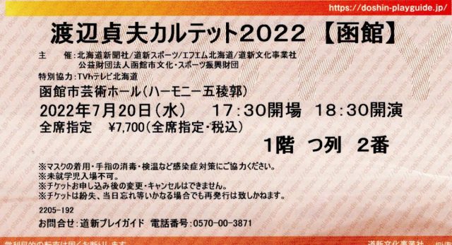 新型コロナ感染防止対策を万全にして入場した函館市芸術ホール。入場制限が解かれたこともあり会場は「ナベサダ」ファンで満席状態。来場者の大半は熟年層だったが、その半数以上が女性。彼が奏でる甘いアルトサックスの音色が誘因かも。