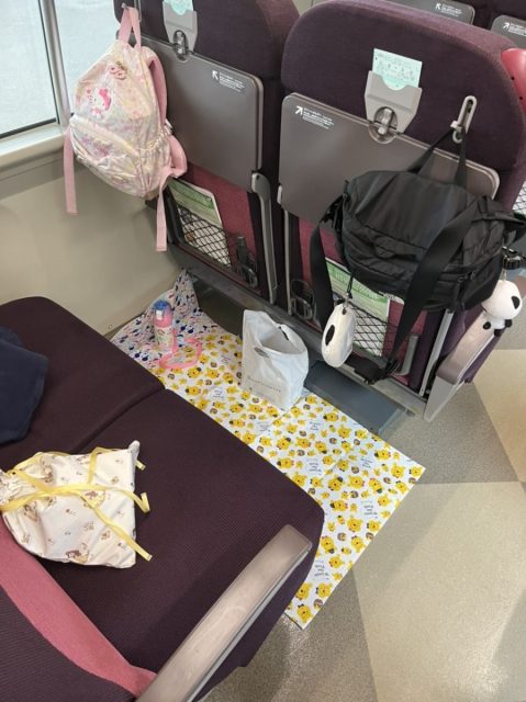100均でレジャーシートを2枚購入して足元に敷きました。以前から、特急に乗る時はチラシを持参して靴を脱いでたので、娘も脱がせて椅子に縛り付けなくてもいいようにしました。床に座っても安心!レジャーシートに座り、椅子をテーブル代わりにして飛行機の時に大活躍した塗り絵をしたり…