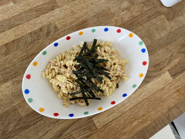 5分で完成、フリンジパスタにツナマヨと麺つゆを和えて海苔刻んヤーツ。