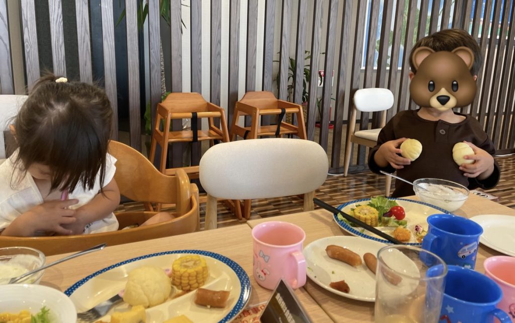 ↑朝、ホテル朝食会場での写真。上の子、ひたすらメロンパンでおっぱいおっぱいやっていました。笑